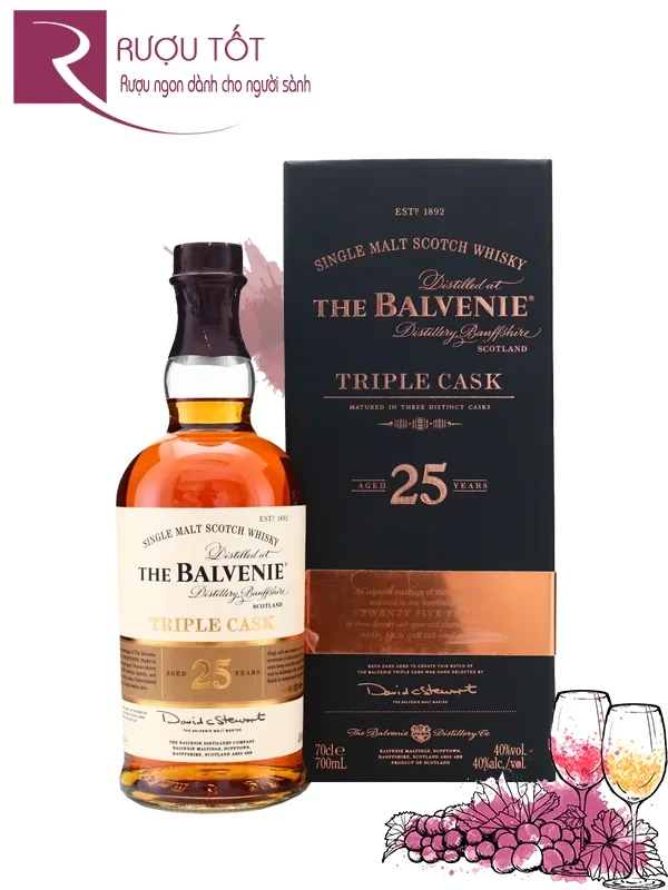 Rượu Balvenie 25 Triple Cask là dòng rượu whisky có tuổi rượu cao nhất (25 năm) trong series Triple Cask (3 loại thùng) của nhà Balvenie, kết hợp đặc điểm mùi vị của thùng ex-sherry butt, ex-bourbon barrel và thùng gỗ sồi truyền thống. Với màu sắc bắt mắt, mùi vị tuyệt hảo cùng hộp đựng sang trọng, chai single malt 40% ABV này sẽ vừa là món quà độc đáo vừa là thức uống thượng hạng để nhâm nhi trong các bữa tiệc với các món ăn thịnh soạn.