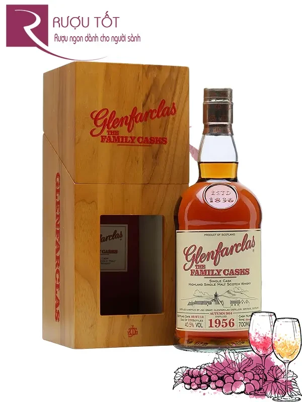 Rượu Glenfarclas 1956 là một phiên bản rượu whisky độc đáo thuộc dòng The Family Casks của nhà Glenfarclas được đóng chai vào tháng 7 năm 2014. Với số lượng giới hạn chỉ 129 chai, sản phẩm này được ủ trong thùng gỗ Sherry mang số hiệu 1768, tạo nên hương vị đặc trưng mà không cần thêm màu nhân tạo. Đây là một trong những chai single malt whisky hiếm có đến từ xứ sở Scotland, thể hiện bản sắc riêng của vùng rượu nổi tiếng Speyside thông qua quy trình chưng cất và ủ rượu truyền thống.