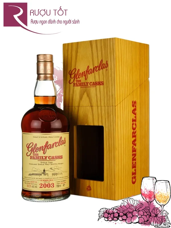Glenfarclas 2003 thuộc bộ sưu tập Family Casks của nhà máy chưng cất Glenfarclas, nổi tiếng với bề dày lịch sử cùng số lượng phiên bản vô cùng lớn với hơn 380 loại rượu được ủ từ năm 1952 đến 2004, hiện đã được mở rộng đến những năm 2007. Series rượu whisky này bắt nguồn từ tầm nhìn vĩ đại của George S Grant nhằm mang đến những trải nghiệm cổ điển, tưởng nhớ tới những sự kiện trong quá khứ thăng trầm của gia đình Grant (chủ sở hữu của Glenfarclas).