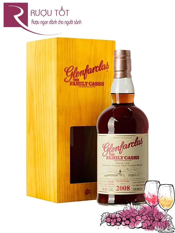 Rượu Glenfarclas 2008 với phiên bản phát hành mới nhất vào mùa thu năm 2023 (S23). Nhãn chai này thuộc dòng Family Casks, một loại whisky đặc biệt từ Glenfarclas bao gồm các vintage hiếm, được chưng cất vào các năm khác nhau và đóng chai ở cask strength.