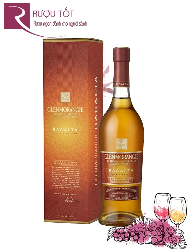 Rượu Glenmorangie Bacalta là dòng single malt whisky thuộc bộ sưu tập Private Edition của Glenmorangie, được phát hành lần đầu vào năm 2017. Sản phẩm này nổi bật nhờ quá trình ủ đặc biệt trong thùng gỗ Madeira Malmsey, mang đến hương vị độc đáo với sự kết hợp giữa trái cây ngọt ngào, gia vị nhẹ nhàng và hậu vị kéo dài.
