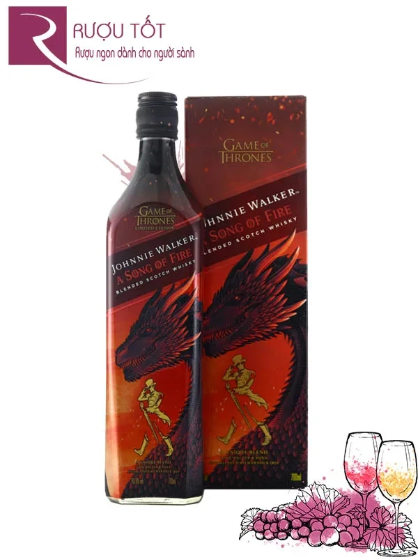 Rượu Johnnie Walker A Song Of Fire là chai rượu whisky pha trộn nhiều loại mạch nha đơn cất từ Caol Ila, sở hữu nồng độ 40,8% cùng thiết kế đẹp mắt với hình ảnh rồng lửa hung hãn – biểu tượng sức mạnh của nhà Targaryen trong series phim giả tưởng “Game Of Thrones”. Toàn bộ chai rượu được bao phủ bởi một màu đỏ thẫm, tái hiện khung cảnh những trận chiến ở Westeros. Được phát hành vào năm 2019, sản phẩm gây ấn tượng với mùi của khói, gia vị nướng Địa Trung Hải, gỗ sồi cùng các loại hạt.