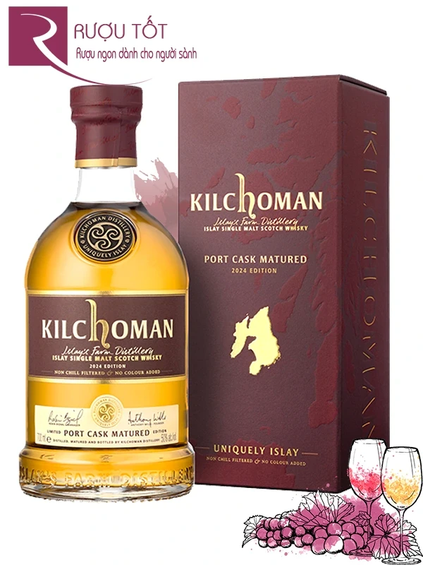 Kilchoman Port Cask Matured 2024 Edition là phiên bản giới hạn được ủ hoàn toàn trong thùng rượu vang đỏ Port mang đến sự kết hợp độc đáo giữa đặc trưng khói than bùn của Islay và hương vị ngọt ngào trái cây của rượu Port.