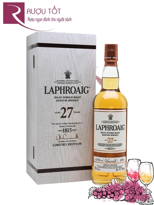 Laphroaig là một trong những nhà máy chưng cất nổi tiếng nhất vùng Islay, được thành lập vào năm 1815 và trở thành biểu tượng của dòng whisky mạnh mẽ với hương vị đặc trưng của than bùn và biển. Được biết đến với phương pháp chưng cất truyền thống, Laphroaig nổi bật nhờ các dòng whisky lâu năm như Laphroaig 10, 18, 25 năm tuổi. Việc ra mắt phiên bản 27 năm tuổi vào năm 2017 là một cột mốc đáng nhớ, nhằm tiếp nối các dòng sản phẩm đẳng cấp nhưng vẫn giữ lại phong cách mộc mạc, thuần túy của Laphroaig.
