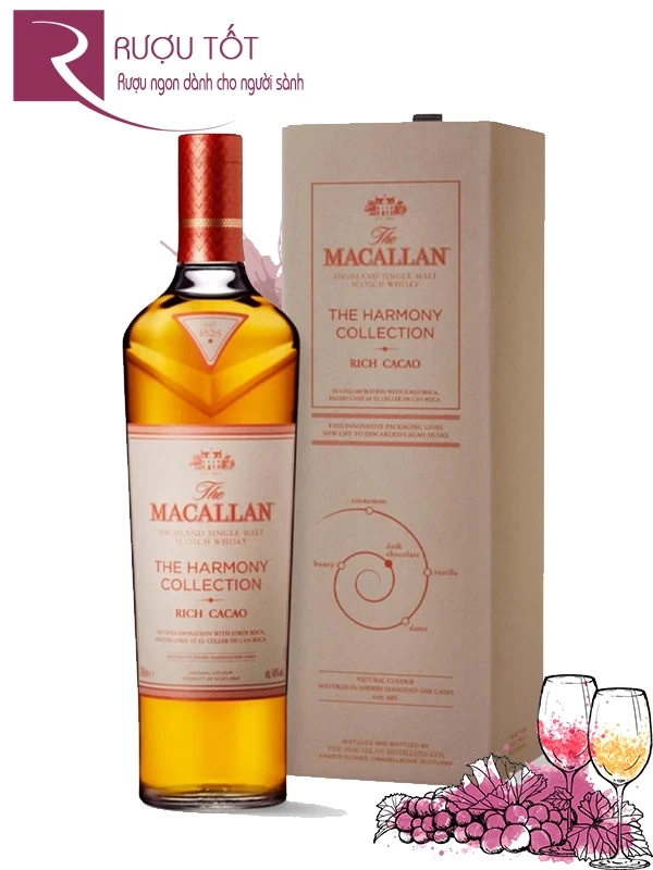 Macallan Rich Cacao là một tuyệt phẩm whisky có số lượng giới hạn với sự kết hợp tinh tế giữa hương vị chocolate và rượu mạch nha. Loại rượu mạnh cao cấp này được chế tác bởi bậc thầy pha chế Polly Logan, lấy cảm hứng từ chuyến viếng thăm khách sạn và xưởng sản xuất chocolate Casa Cacao của gia đình Roca, Macallan The Harmony Rich Cacao mang đến trải nghiệm thưởng thức độc đáo, hài hòa giữa hai thế giới whisky và chocolate. Đây là minh chứng cho cam kết bền vững và sự sáng tạo không ngừng của thương hiệu Macallan danh tiếng.