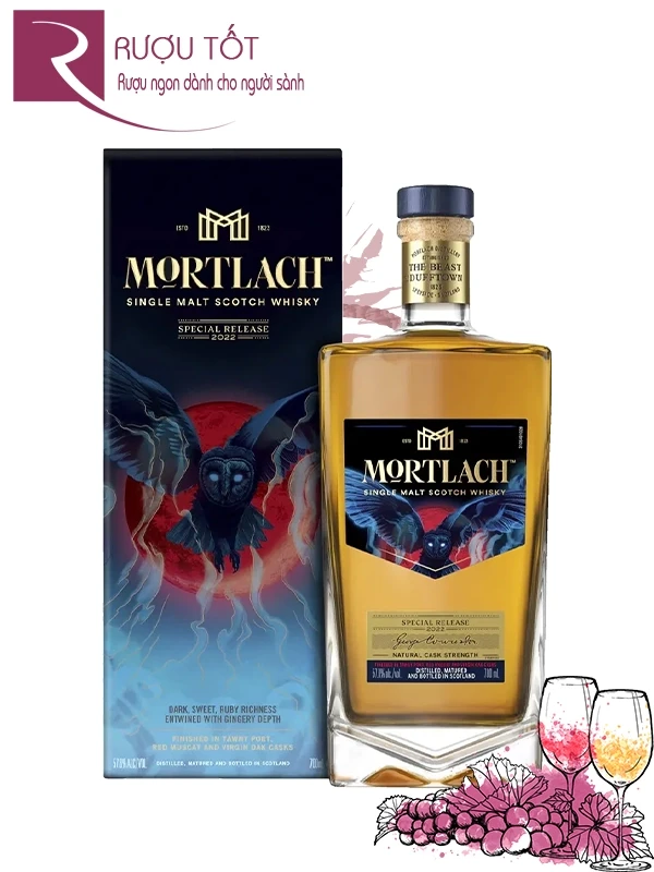 Rượu Mortlach 2022 – dòng No age statement whisky (whisky không số) là sản phẩm thuộc bộ sưu tập Special Releases 2022 do Diageo phát hành. Phiên bản lần này thu hút giới sành rượu bởi quá trình hoàn thiện trong thùng gỗ sồi muscat và tawny port, hứa hẹn mang đến hương vị đậm đà và cay nồng, với nhiều lớp trái cây đỏ sẫm.