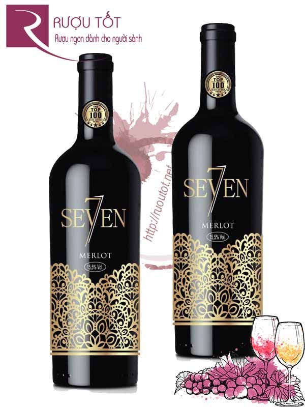 Seven Merlot được đầu tư thiết kế rất tỉ mỉ, kĩ càng từng đường nét. Tông màu chủ đạo là màu đen huyền bí từ nắp đến đáy chai và giấy nhãn hiệu. Duy chỉ có trên thương hiệu và hình ảnh trên nhãn là có màu khác. Tên rượu và tên nhà sản xuất được in chữ màu vàng tinh khôi. Ở giữa có một hình tròn chứa nồng độ cồn.