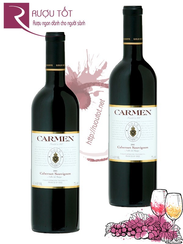 Rượu vang Carmen Gold Reserve Cabernet Sauvignon là dòng vang đỏ thượng hạng được sản xuất bởi Carmen, nhà làm rượu vang lâu đời tại Chile. Được sản xuất từ giống nho Cabernet Sauvignon trồng tại những vườn nho chọn lọc, chai vang mang hương vị phức hợp và đậm đà. Carmen Gold Reserve Cabernet Sauvignon thường được đóng trong thùng 6 chai 750ml sang trọng, nhập khẩu và phân phối rộng rãi tại nhiều quốc gia, trong đó có Việt Nam.